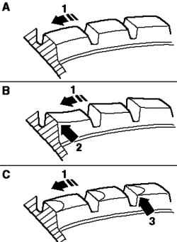 C – Блоки профиля, вид в направлении качения стрелка 1, имеют сильный износ в передней части «зуба» стрелка 3.