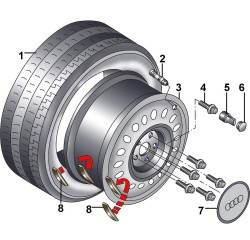 Рис. 13.2. Колесо: 1 – шина; 2 – вентиль; 3 – диск; 4 – болт крепления колеса M14x1,5x27,5, 120 Н·м; 5 – противоугонная проставка ; 6 – декоративная крышка; 7 – пылезащитный колпак; 8 – балансировочные грузики
