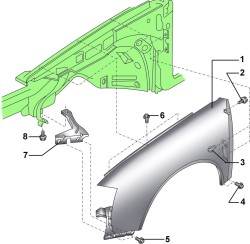Рис. 16.9. Переднее крыло: 1 – переднее крыло; 2, 3, 4, 5, 8 – болты, 10 Н·м; 6 – болт, 15 Н·м; 7 – кронштейн