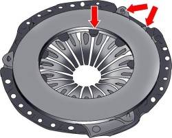 Проверьте надежность пружинного соединения между нажимным диском и кожухом сцепления. Не допускаются царапины и отсутствие или повреждение заклепок (рис. 8–11).