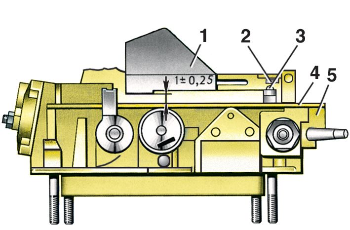 осторожно подогнуть язычок 2 рычага поплавка для получения требуемого
