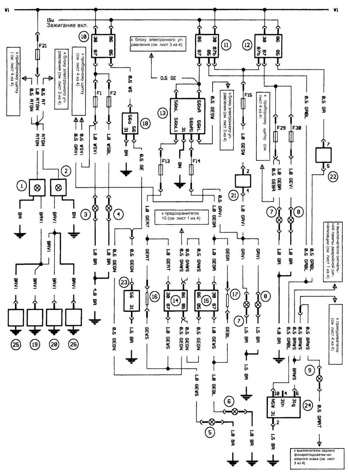 Типичная принципиальная схема для центральной системы блокировки дверей, противоугонной сигнализации, бортового компьютера, дополнительного отопителя и цифровых часов (1 из 2)