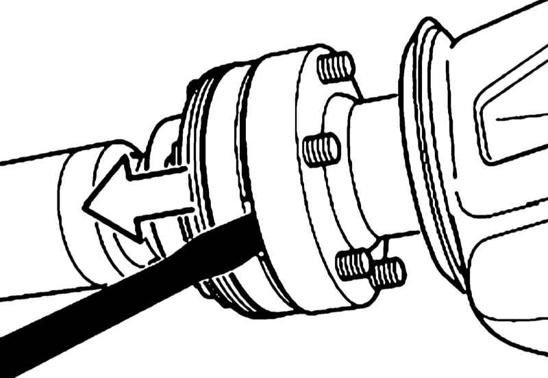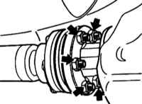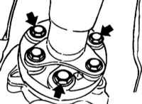 Надавите на промежуточную опору так, чтобы карданный вал прогнулся вниз. Отсоедините ШРУС от редуктора заднего моста и снять карданный вал с фланца выходного вала трансмиссии.