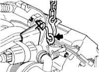 Отсоедините защитный кожух плюсового контакта в двигательном отсеке от масляного картера и от правой опоры двигателя. Отсоедините положительный провод аккумуляторной батареи от стартера и от левого опорного кронштейна.