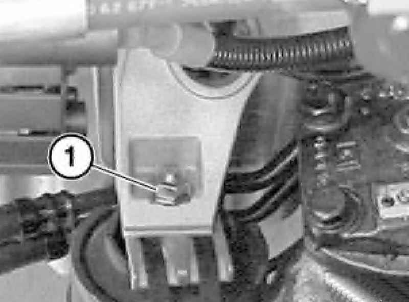 - Выверните болт (1) на корпусе масляного фильтра и снимите направляющую (2) щупа уровня двигательного масла.
