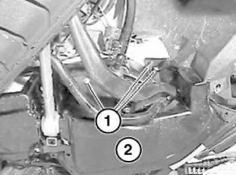 - Выверните болты (1) и снимите элемент жесткости (2) с левой и с правой стороны автомобиля.