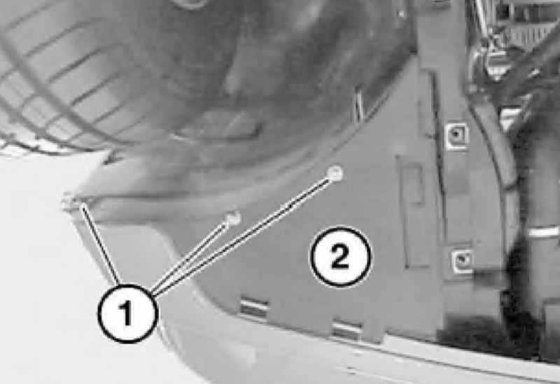 - С обеих сторон автомобиля выверните болты (1) и снимите левый и правый нижние кожухи (2) переднего бампера.