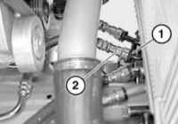 - Отожмите шланг (2) охлаждения ГУР в направлении охлаждающего контура, отожмите черное фиксирующее кольцо (1) назад и удерживайте его в таком положении. Отсоедините шланг (2) и соберите вытекшее масло.