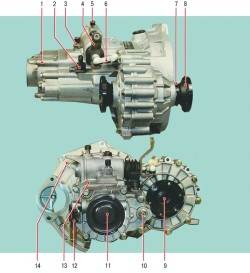 Рис. 6.4. Коробка передач: 1 – задняя крышка коробки передач; 2 – датчик скорости; 3 – выключатель света заднего хода; 4 – рычаг переключения передач; 5 – сапун; 6 – промежуточная тяга выбора передач; 7 – сальник полуоси; 8 – правая полуось; 9 – левая полуось; 10 – пробка отверстия для заливки масла; 11 – заглушка задней крышки коробки передач; 12 – рычаг выключения сцепления; 13 – картер коробки передач; 14 – картер сцепления