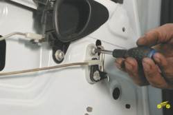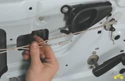 2. Отсоедините тяги внутренней ручки и блокировки замка (см. «Снятие и установка замка задней двери»).