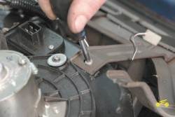 12. Ослабьте хомуты на подводящем и отводящем шлангах радиатора и снимите шланги.