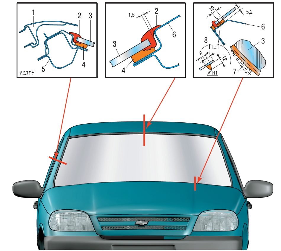 На рисунках показано, как устанавливают стекла на заводе-изготовителе, поэтому толщина шва и некоторые другие параметры могут отличаться от сведений, указанных в инструкции к набору для вклейки стекол.