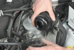 5. Для предотвращения вытекания жидкости заглушите отверстие в штуцере бачка, опустите конец отводящего шланга в емкость для сливаемой жидкости. Пустите двигатель и, повернув рулевое колесо от упора до упора в обе стороны три-четыре раза, слейте старую жидкость, одновременно доливая новую. Повторяйте операцию до появления свежей жидкости из отводящего шланга.