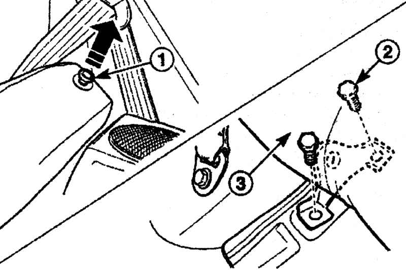 Рис. 10.24. Расположение болтов (1) крепления салазок, электрический разъем (2) контрольной лампы ремня; направление снятия переднего сиденья (3)
