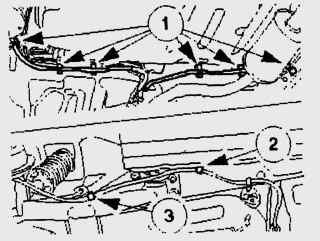 Рис. 14.30. Крепление задних тросов стояночного тормоза: 1 – опоры; 2 – зажим; 3 – фиксатор
