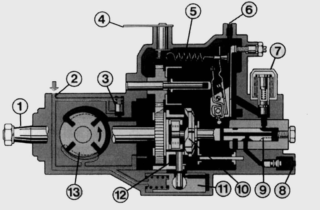 Рис. 8.13. Топливный насос высокого давления (ТНВД) в разрезе: 1 – приводной вал; 2 – подача топлива; 3 – редукционный клапан; 4 – ручка тяги ручного управления акселератором; 5 – центробежный регулятор; 6 – отверстие возврата топлива; 7 – электромагнитный клапан прекращения подачи топлива; 8 – топливопроводы к форсункам; 9 – плунжер распределительного ТНВД; 10 – кулачковая шайба; 11 – муфта опережения момента впрыска топлива (здесь для лучшего представления повернута на 90°); 12 – ролик; 13 – подкачивающий лопастный насос (также повернут на 90°)