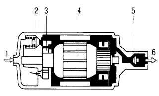 Рис. 188. Конструкция топливного насоса: 1 — подводящая магистраль; 2 — редукционный клапан; 3 — корпус фильтра; 4 — топливный насос с электроприводом; 5 — обратный клапан; 6 — подающая магистраль