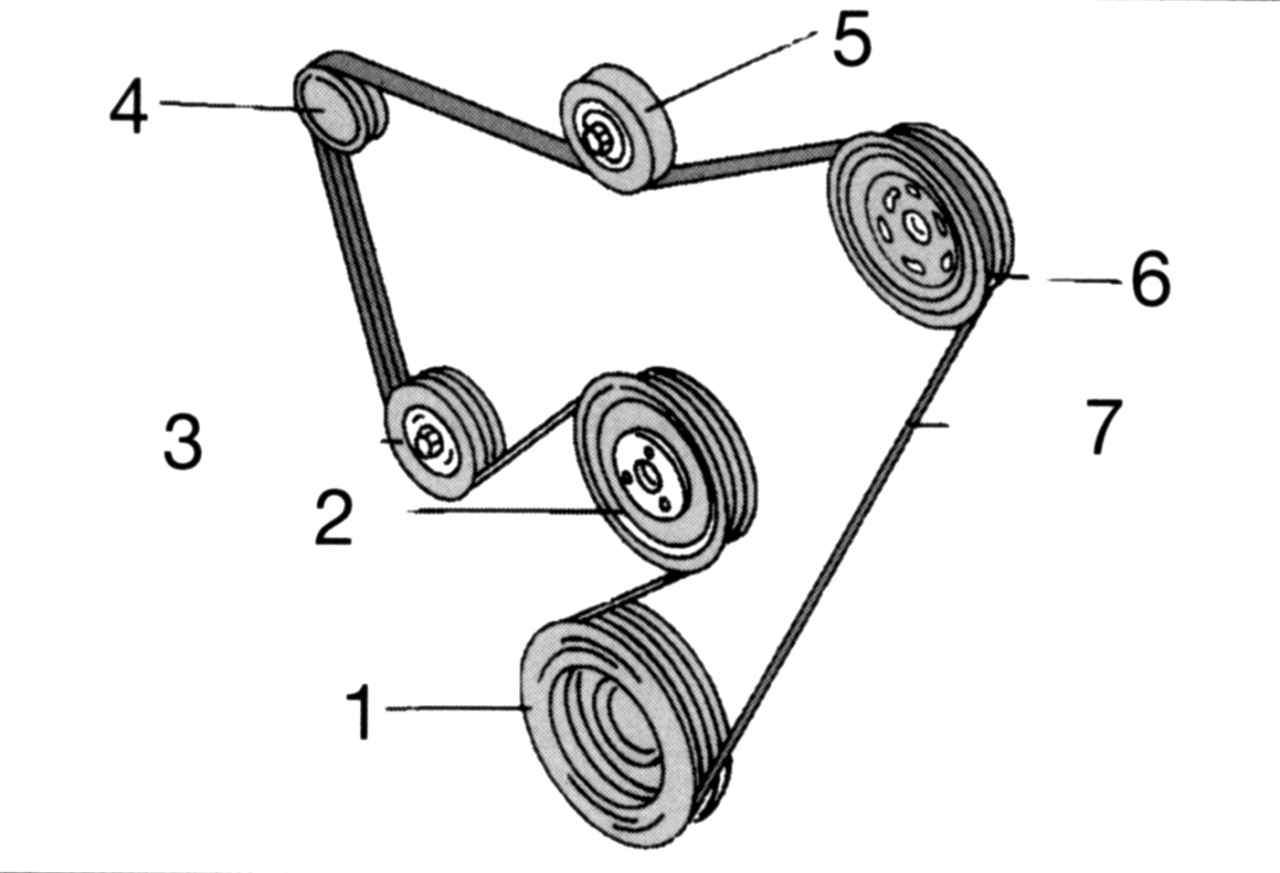 Рис. 300. Схема прокладки приводного ремня на 16-клапанном двигателе без кондиционера: 1 — ременный шкив коленчатого вала; 2 — ременный шкив жидкостного насоса; 3 — натяжной ролик ремня; 4 — ременный шкив генератора; 5 — направляющий ролик; 6 — ременный шкив гидроусилителя рулевого управления; 7 — приводной ремень