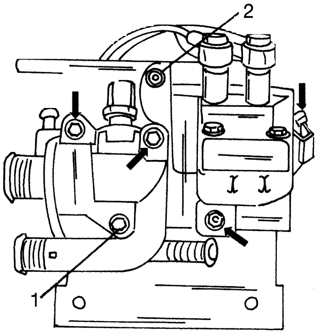 Рис. 72. Крепление корпуса (1) термостата и катушки зажигания с держателем (2)