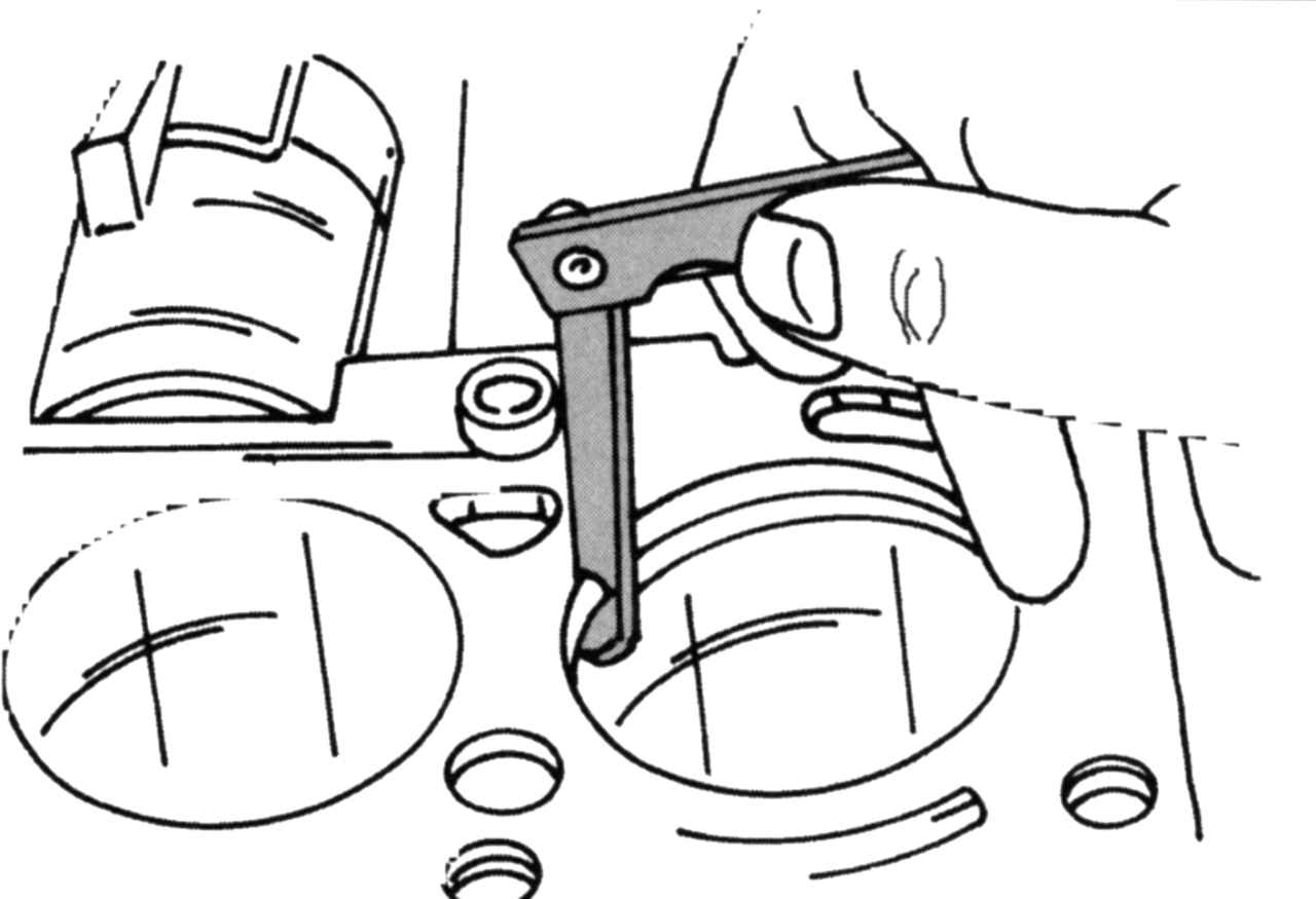 Вставьте по очереди поршневые кольца с верхней стороны в соответствующее отверстие цилиндра и измерьте щупом стыковой зазор кольца между обоими концами поршневого кольца. Измерение проводится способом, показанным на рис. 79. На практике зазор может быть больше номинального на 0,15 мм. Если размеры не соответствуют предельным значениям, их нужно заменить.