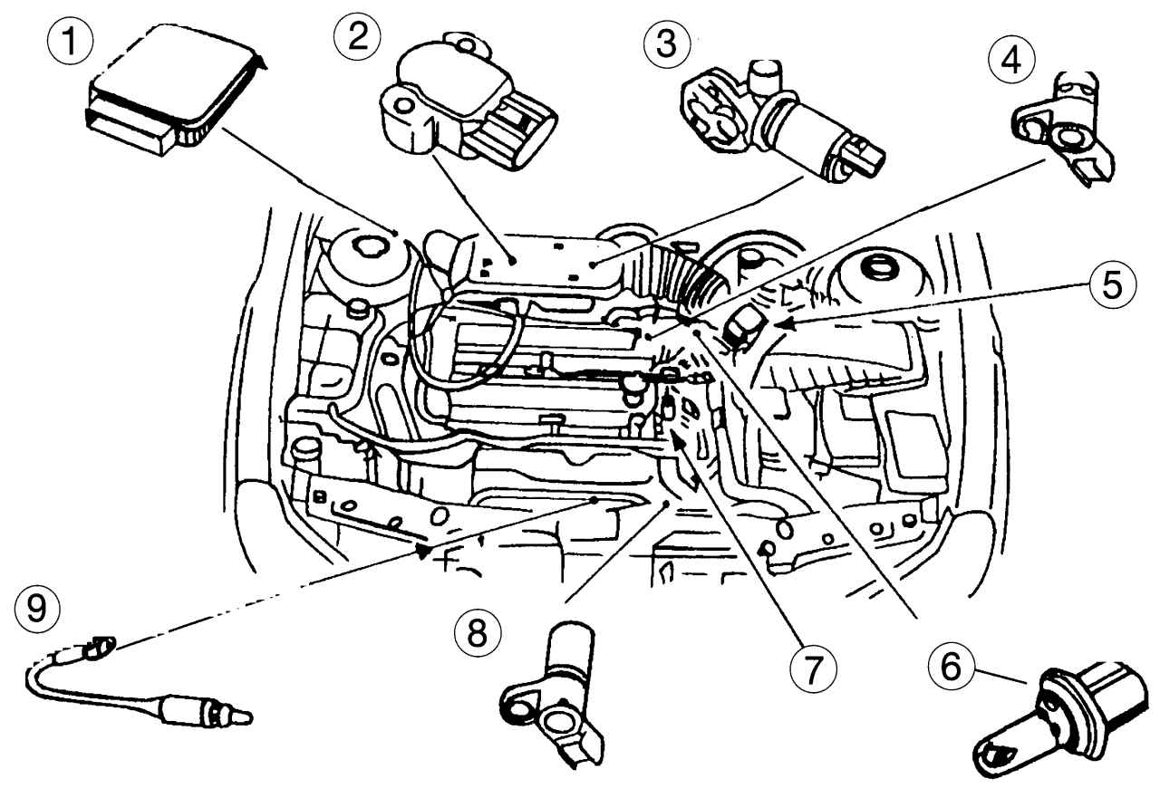 Рис. 142. Расположение в моторном отсеке некоторых узлов 16-клапанного двигателя: 1 — блок управления EECV; 2 — датчик положения дроссельной заслонки; 3 — воздушный клапан регулировки холостого хода; 4 — датчик положения распределительного вала; 5 — воздухомер; 6 — датчик температуры впускаемого воздуха; 7 — датчик температуры охлаждающей жидкости; 8 — датчик положения коленчатого вала; 9 — обогреваемый лямбда-зонд
