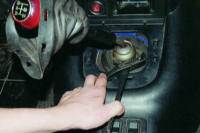 Раздвижными пассатижами отворачиваем колпачковую гайку крепления рычага к механизму переключения передач...