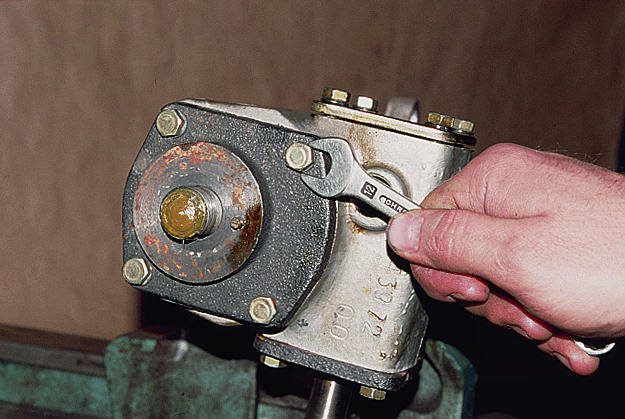 Устанавливаем рулевой механизм в тисках, зажав его за бобышки картера под болты.
