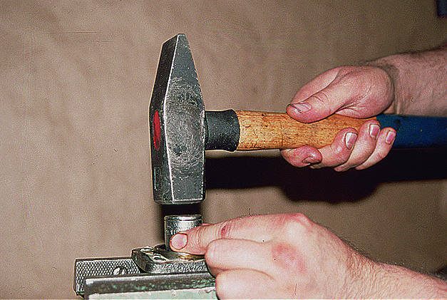 ...и постукивая латунным молотком, напрессовываем роликовый подшипник вала сошки, одновременно вдвигая вал в картер рулевого механизма.