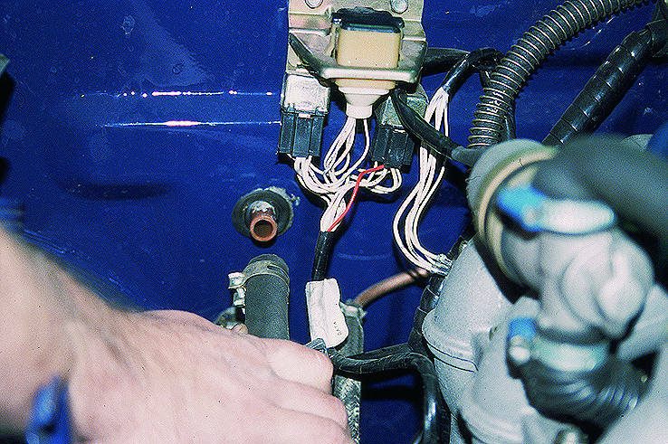 Ключом или головкой “на 13” отворачиваем гайку верхнего крепления отопителя и снимаем со шпильки “массовый” провод.