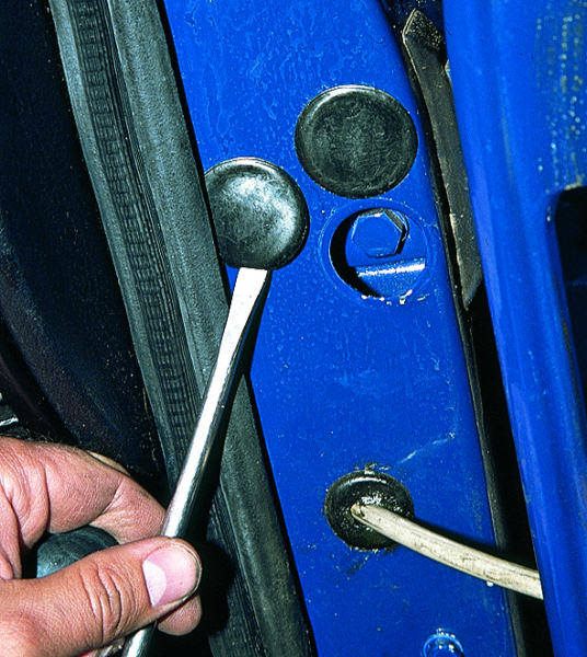 Отверткой поддеваем и вынимаем 6 пластиковых заглушек стойки.
