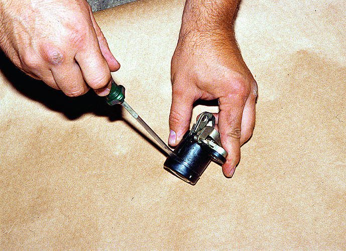 Шлицевой отверткой поддеваем и вынимаем три пистона крепления накладки замка…