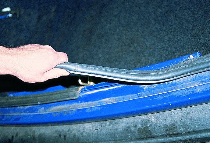 Снимаем уплотнитель, начиная с разреза в районе защелки замка.