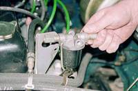 Придерживая переходник ключом “на 17”, ключом “на 14” отворачиваем штуцер отводящего шланга и отсоединяем его от фильтра.
