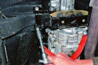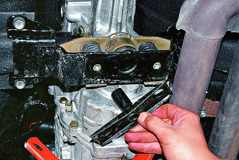 Устанавливаем упор или вертикальный домкрат под картер коробки передач.