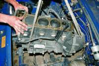 При отсутствии тали или тельфера, пропустив под двигатель прочную веревку, цепь или трос, вдвоем поднимаем его с помощью стальной трубы диаметром около 80 мм. При этом надо контролировать положение двигателя в моторном отсеке, следя за тем, чтобы он не повредил проводку или другое оборудование (показано со снятой головкой блока).