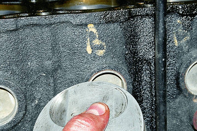 На днище поршня выбито два обозначения. По букве, нанесенной краской, на новом блоке поршень подбирается к цилиндру.