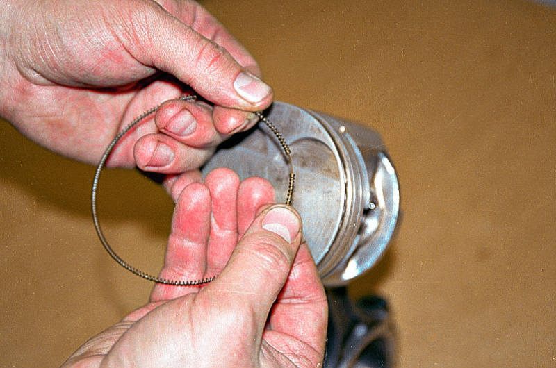 Раздвинув замок расширителя маслосъемного кольца, надеваем его на поршень в нижнюю канавку, и сводим замок.