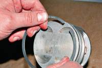 Надеваем нижнее компрессионное кольцо надписью “ВЕРХ” к днищу поршня.