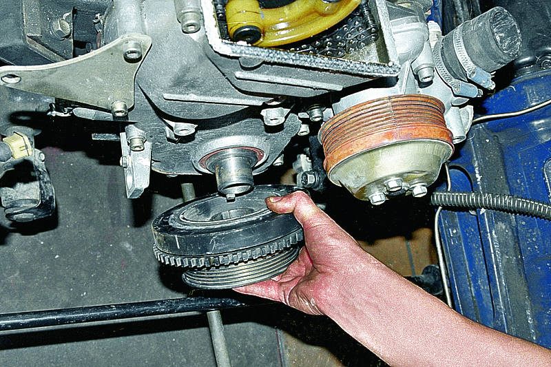 Снимаем брызговик двигателя, ремень привода навесных агрегатов, датчик синхронизации, электровентилятор радиатора (см. соответствующие разделы).