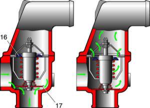 11 – пробка расширительного бачка; 12 – расширительный бачок; 13 – сливной краник радиатора; 14 – датчик включения электровентилятора; 15 – насос охлаждающей жидкости; 16 – основной клапан термостата; 17 – байпасный клапан; А – термостат закрыт; В – термостат открыт.