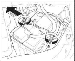 Для замены лампы левой фары отверните гайки стержней крепления аккумуляторной батареи и сдвиньте батарею по направлению к ветровому стеклу, чтобы освободить место для работы.