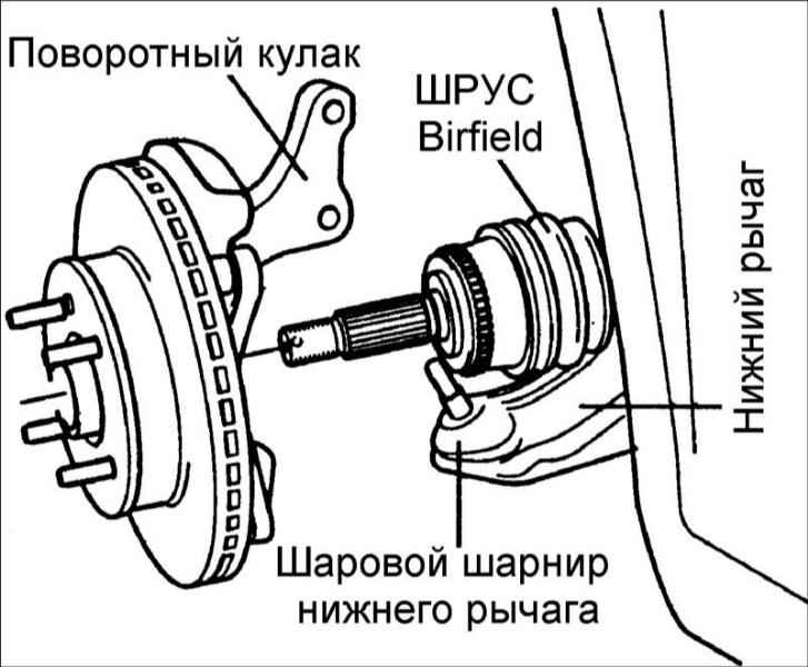 - Практически поворотный кулак должен быть установлен в нижнем рычаге одновременно с установкой ШРУСа Birfield в поворотный кулак.