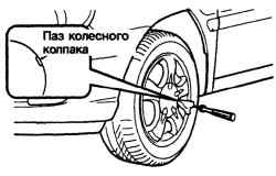 Оберните кусок ткани вокруг конца монтажки, чтобы не повредить поверхность колпаков и дисков. Вставьте монтажный ключ в паз колесного колпака, аккуратно отожмите и снимите колпак ( рис. 1.143).