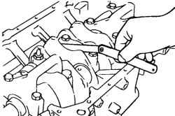 Снимите ремень привода ГРМ, корпус масляного насоса, маховик, головку цилиндров в сборе и масляный поддон. Процедуры снятия деталей приведены в соответствующих разделах.