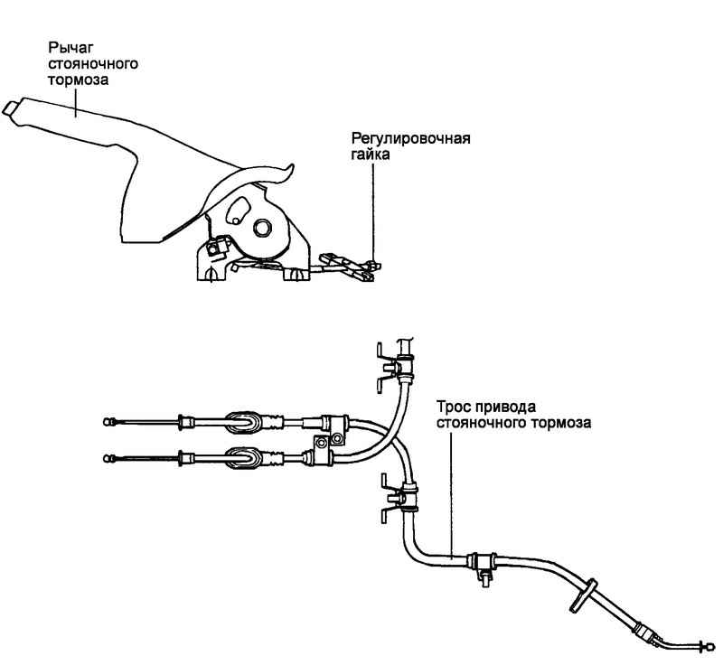 Ослабьте регулировочную гайку и отсоедините от рычага трос стояночного тормоза ( рис. 6.55).