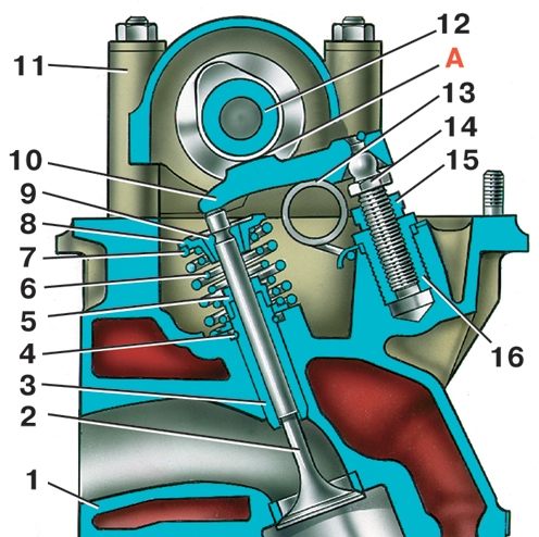 Распределительный вал 16 чугунный литой, имеет пять опор и восемь кулачков. Рабочие поверхности кулачков азотированы. Вал установлен в съемном корпусе 15, закрепленном на головке блока десятью шпильками. На переднем конце вала установлена ведомая звездочка 13 привода.