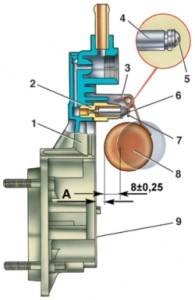 2. Проверьте в этом положении зазор А между средней частью поплавка и поверхностью прокладки 9, плотно прижатой к фланцу крышки. Зазор должен быть равен (6,5±0,25) мм.