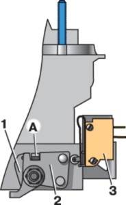 Рис. 2.113. Регулировка положения микропереключателя: 1 – рычаг, закрепленный на оси дроссельной заслонки первой камеры; 2 – рычаг привода дроссельных заслонок; 3 – микропереключатель; А – усик рычага 1