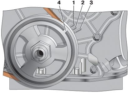 Рис. 2.40. Cнятие упорного фланца распределительного вала: 1 – упорный фланец; 2 – распределительный вал; 3 – корпус подшипников; 4 – гайка шпильки крепления упорного фланца;