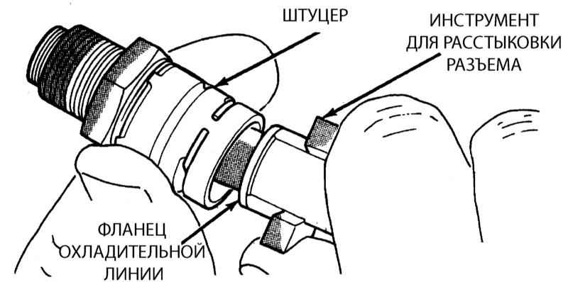 Если штуцеры, шланги или трубки охладительных линий покрыты грязью, смазкой или пылью, очистите перед расстыковкой с применение обезжиривателя. Пластмассовый инструмент для расстыковки компонентов не войдет в разъем, если последний будет заполнен посторонними частицами.